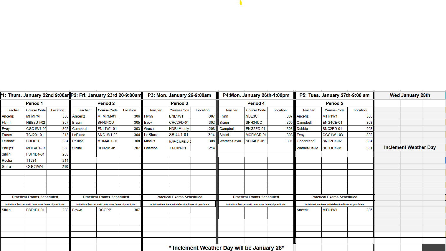 1. If there is an inclement weather day where all schools are closed during the exam schedule, all exams scheduled for that particular day will move into the day reserved for this possibility which is Wednesday January 28th.