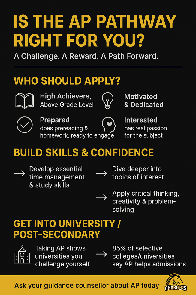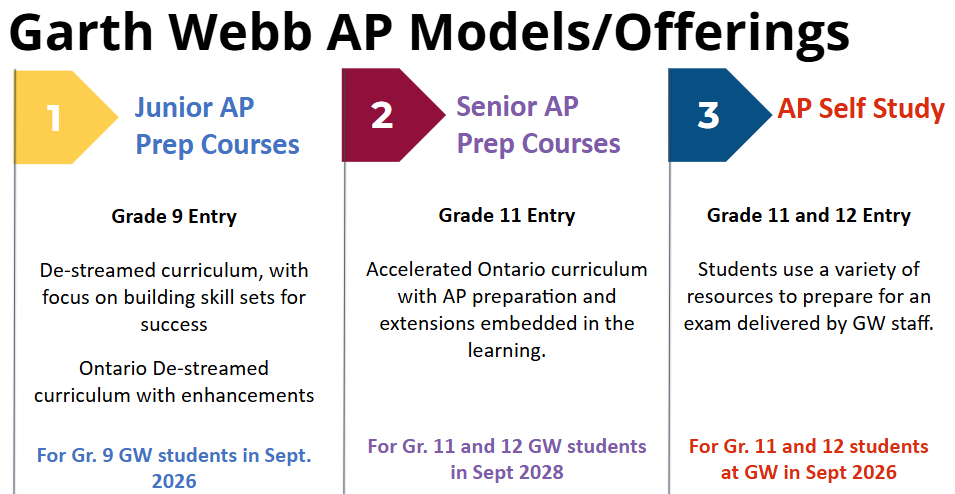 AP Self Study and AP Exams are available to any student registered at Garth Webb. Information will be shared in September 2026 to all students interested in pursuing AP Self Study and AP Exams, to ensure they are well prepared to participate in the AP examination process. All students are welcome and encouraged to prepare for and complete AP Exams.