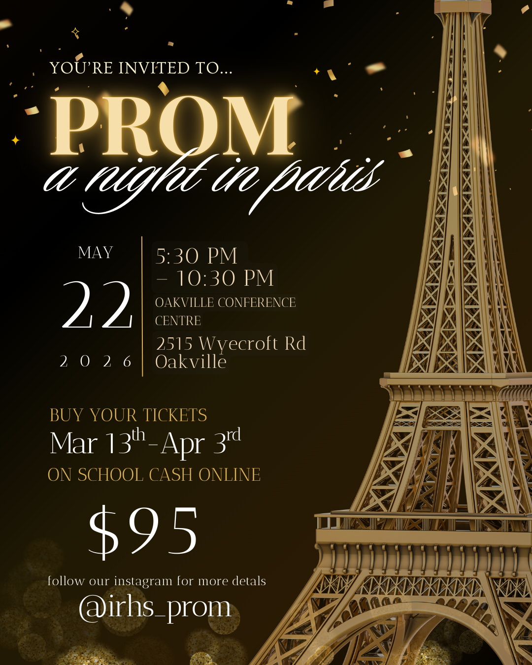 This year's grade 12 Prom will take place on Friday, May 22nd, from 5:30 pm to 10:30 pm at the Oakville Conference Centre (2515 Wyecroft Rd). The theme for the event is 'A Night in Paris'.