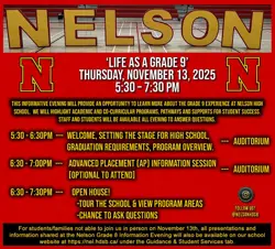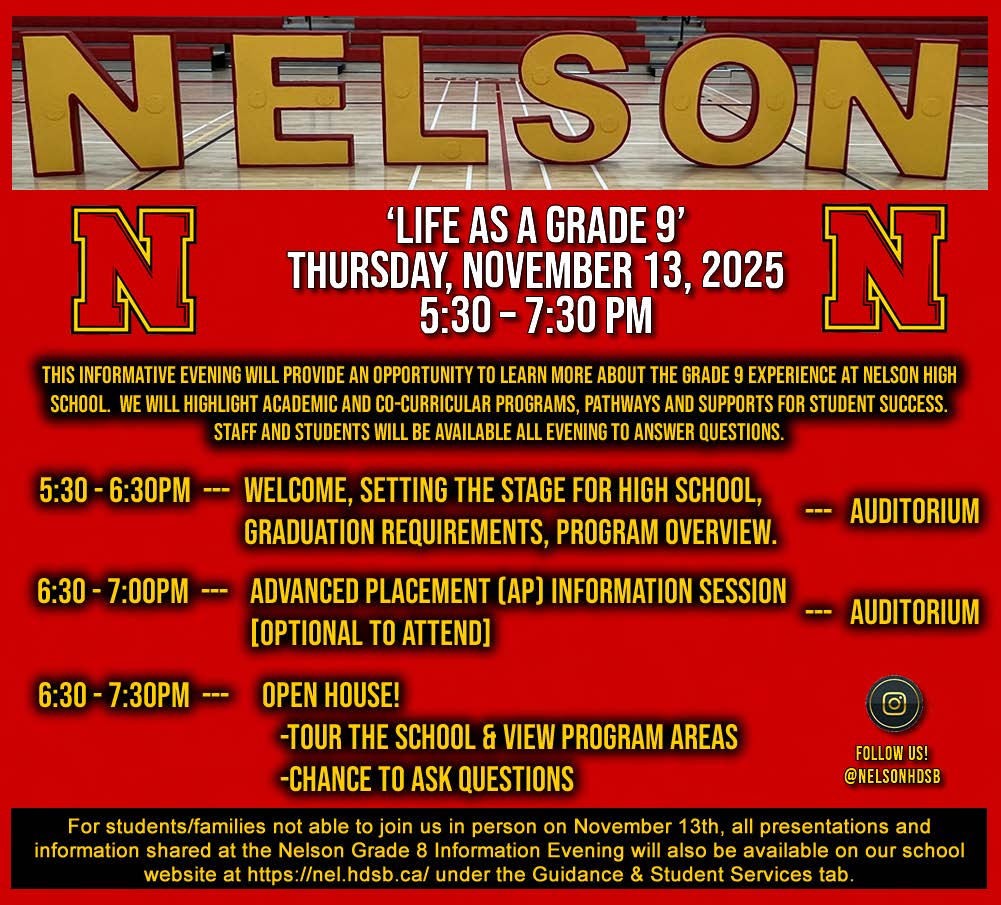 We are hosting our annual evening for our incoming grade 9 students (currently grade 8) on Thursday November 13 from 5:30 - 7:30. The formal presentation starts at 5:30 and the ‘Open Doors’ school tours begin at 6:30. We are excited to welcome the community in to hear more about the exciting programs at Nelson.