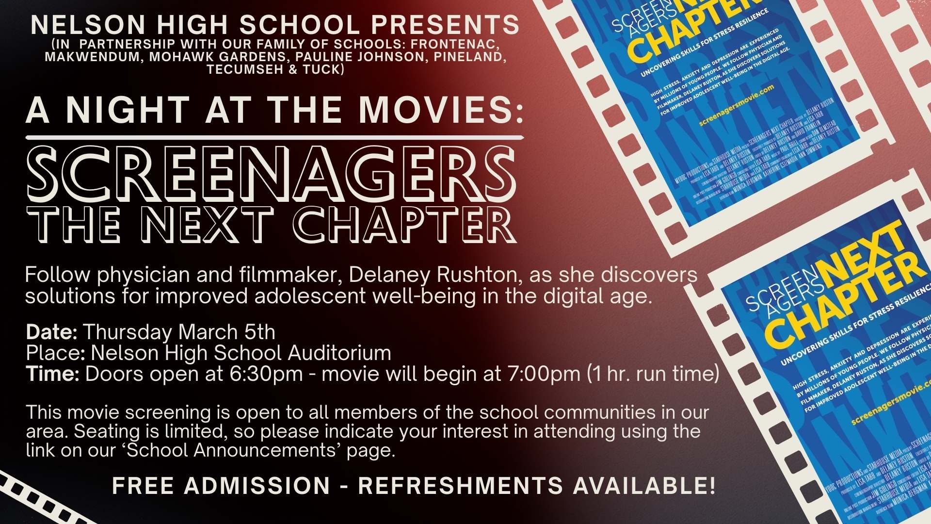 We are excited to announce the partnership of our Family of Schools (Frontenac, Makwendum, Mohawk Gardens, Nelson, Pauline Johnson, Pineland, Tecumseh, Tuck) to present ‘Screenagers - The Next Chapter’ on Thursday March 5th in the Nelson Auditorium. Synopsis: ‘Millions of young people experience high stress, anxiety, and depression. In Screenagers Next Chapter, we follow physician and filmmaker Delaney Ruston as she discovers solutions for improved adolescent stress, anxiety, and depression in the digital age. This movie screening is open to all members of the school communities in our area. Seating is limited, so please indicate your interest in attending using this form. Admission is free and refreshments will be available. Please join us, doors open at 6:30 and the movie will begin at 7:00.